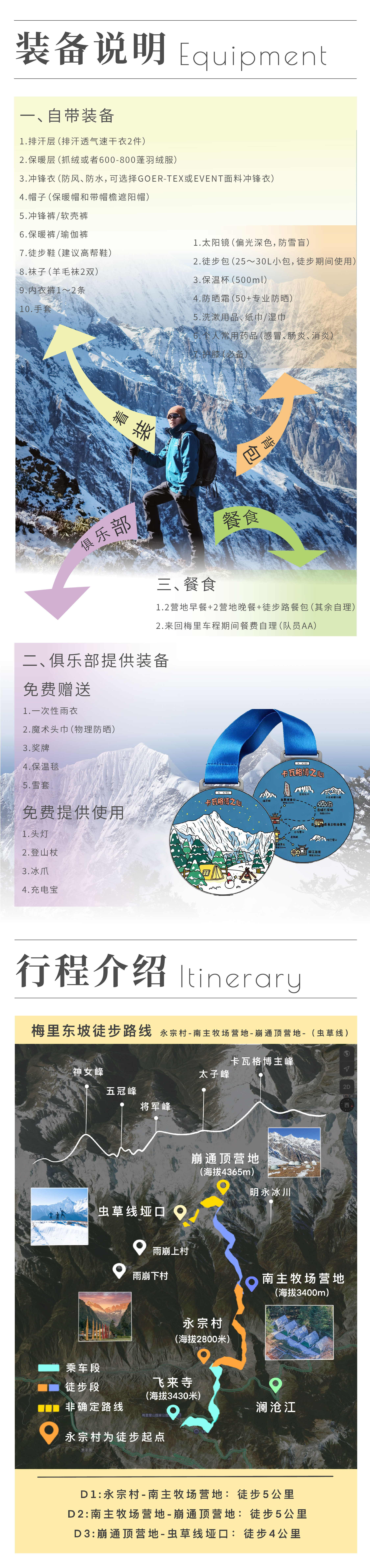 3. 餐食:含2早餐 + 2营地晚餐+徒步路餐包(其余自理)